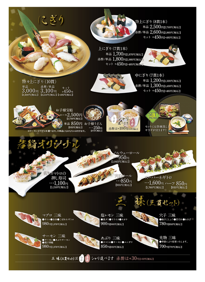 鮨を活かすは握り方次第。若鮨の握りは一貫ずつ個性があって、いずれも主役。人肌を保つことに神経を配りながら、1本(二升)のシャリを丁寧に握り、ネタをのせる。「握る」という所作には、伝統に敬意を示す若鮨の心技体が詰まっている。