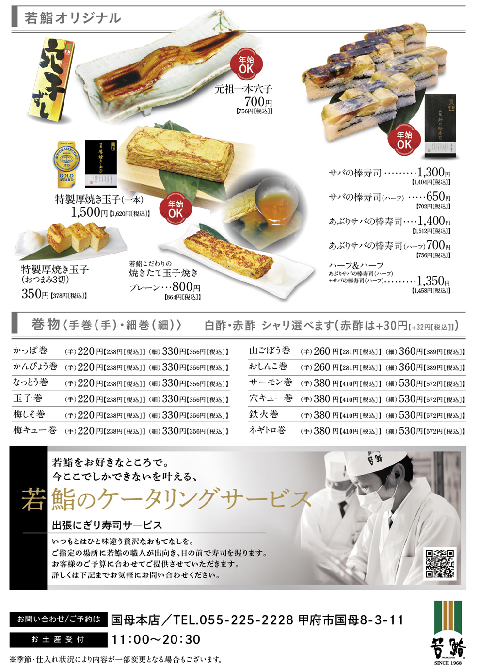 本日のお持ち帰り受付分は終了しました。ご予約はお電話でお願いします。055-225-2228